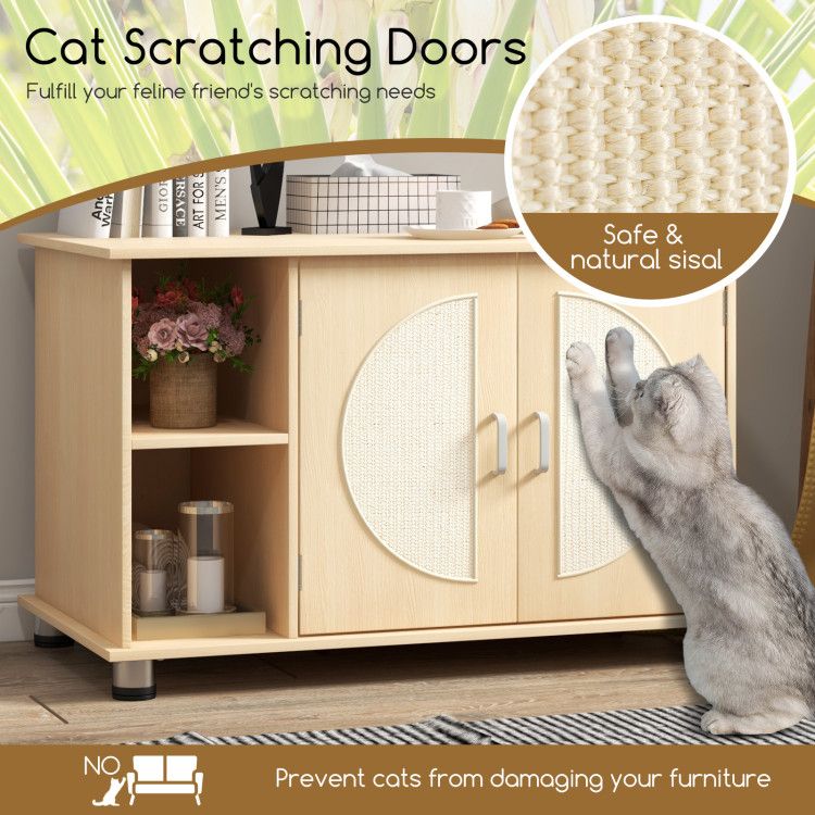 Funny Cat Scratching Doors: The cat litter box enclosure features double doors with scratching boards, which could fulfill your feline friend's scratching needs while protecting your furniture. Moreover, the scratching boards are crafted of safe and natural sisal.