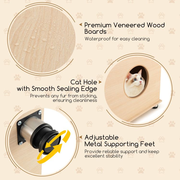 Humanized Features: This wooden cat house is supported by adjustable metal supporting feet, which provide reliable support and keep excellent stability on any surface. Additionally, it boasts a cat hole with smooth sealing edge, which prevents any fur from sticking, ensuring cleanliness.