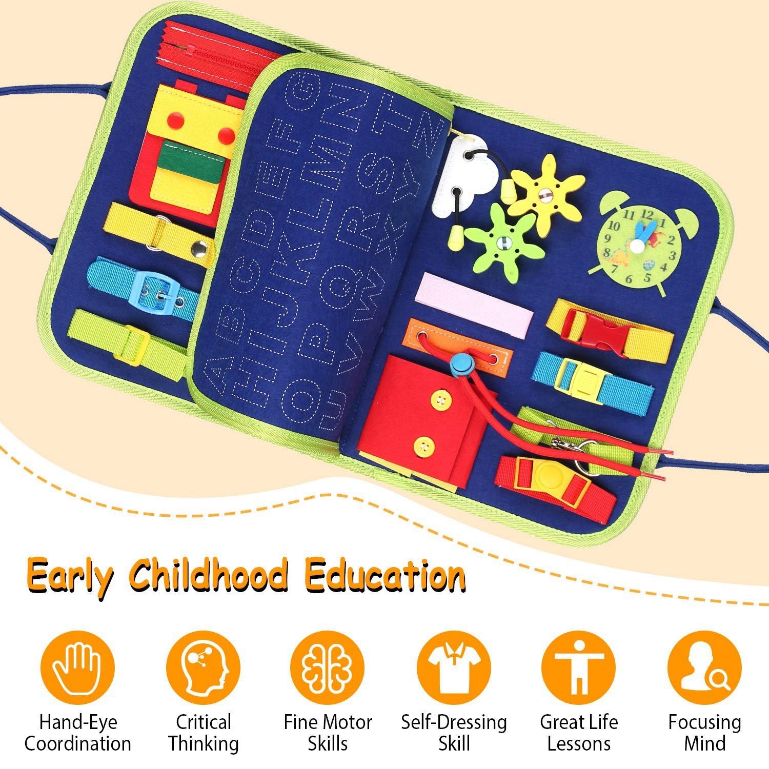 *Multifunctional Montessori Toys*:Designed with several types of buckles; clothing buttons; zippers; shoelaces; snap pocket; drawstring; hook & loop; turning gear and clocks in a foldable board and extra numbers and letters; convenient for kids to learn great life lessons such as touch; turn; open; close; rotate; press; slide; switch; etc. and develop their hand-eye coordination.